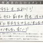2025年9月28日 / 最終更新日 : 2025年9月28日 guest 保護者の皆様・卒業生の声 【保護者の皆様の声】勉強せずテストを迎えていた子が、夜まできちんと勉強していた! 勉強せずテストを迎えていた子が 夜まできちんと勉強していた! 明日でテストもおわり!! 今までならテスト前日の夜も、ほとんど勉強なんてせずに当日をむかえていましたが、昨夜は頑張ってしていました […]