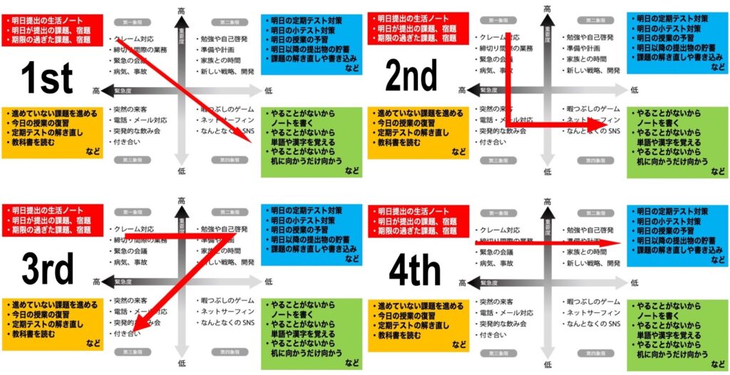 優先順位について社会人の研修などでよく使われる表をベースに、勉強の優先順位を書き込んでいます。