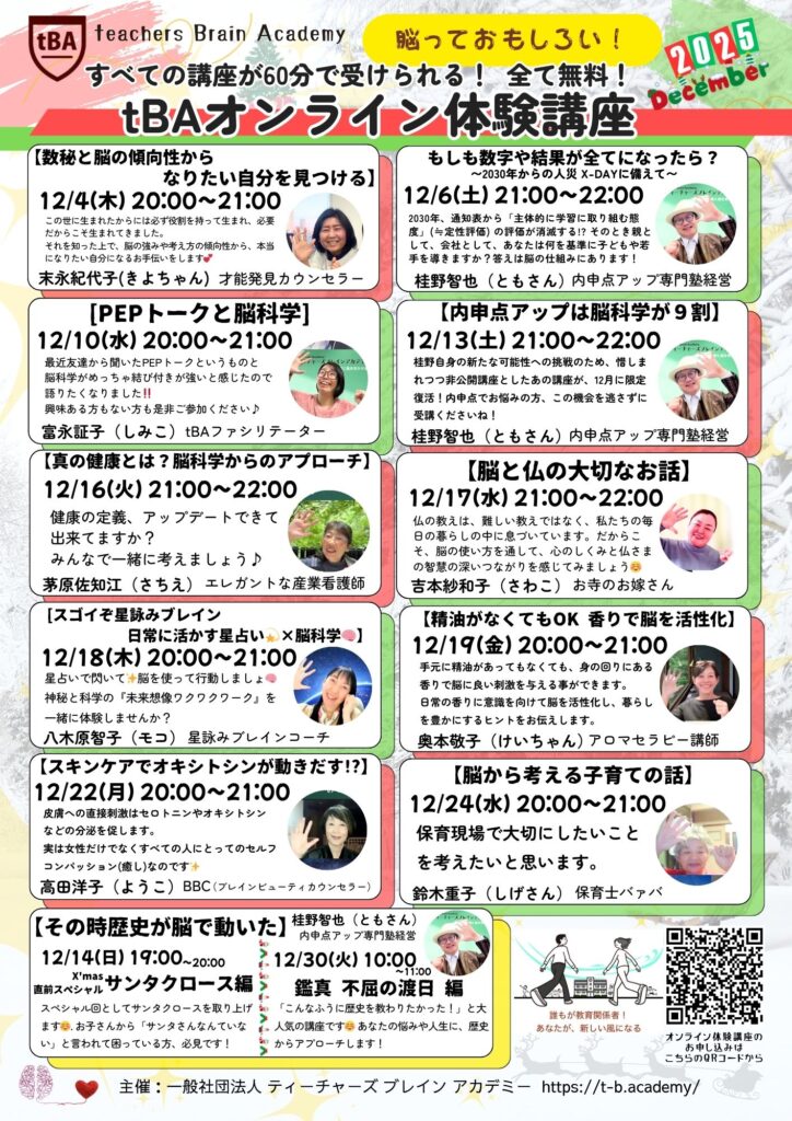 12月1回目に私の担当させていただく体験講座は、12/6(土) 21:00〜22:00、「もしも数字や結果が全てになったら?〜2030年からの人災X-DAYに備えて〜」と題して、脳科学の視点から、2030年度からの学習指導要領の改訂で評価観点が変わると、子どもの世界と大人の世界で何が起こるかを予測していきます!